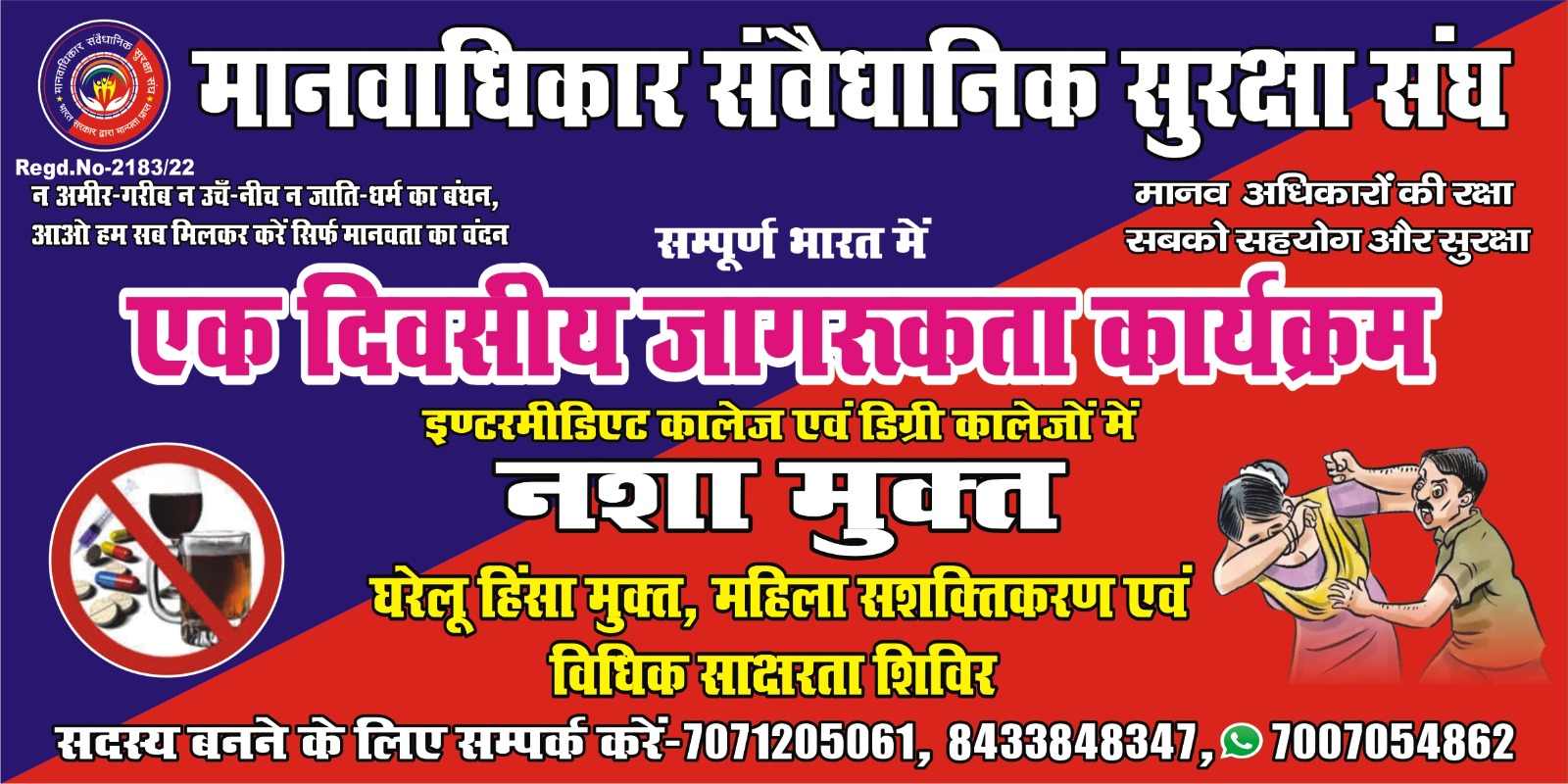 नशा आज समाज के लिए एक गंभीर समस्या बन चुका है, जो न केवल व्यक्ति को शारीरिक और मानसिक रूप से प्रभावित करता है, बल्कि परिवार और समाज को भी बर्बाद करता है। मानवाधिकार संवैधानिक सुरक्षा संघ का "नशा मुक्त भारत कार्यक्रम" इसी उद्देश्य के साथ शुरू किया गया है कि देश को नशा मुक्त बनाया जा सके और स्वस्थ, सशक्त समाज का निर्माण किया जा सके। कार्यक्रम के उद्देश्य: जागरूकता फैलाना: नशे के दुष्प्रभावों के बारे में समाज में जागरूकता फैलाना। नशा मुक्ति सहायता: नशा करने वालों को इससे छुटकारा दिलाने में सहायता करना। कानूनी संरक्षण: नशे के व्यापार और उपयोग पर कानूनी रोकथाम को बढ़ावा देना। पुनर्वास केंद्रों का समर्थन: नशा मुक्त केंद्रों और पुनर्वास सेवाओं को सहयोग प्रदान करना। युवाओं को दिशा देना: युवाओं को नशे से बचाने के लिए सही मार्गदर्शन और सकारात्मक गतिविधियों में संलग्न करना।